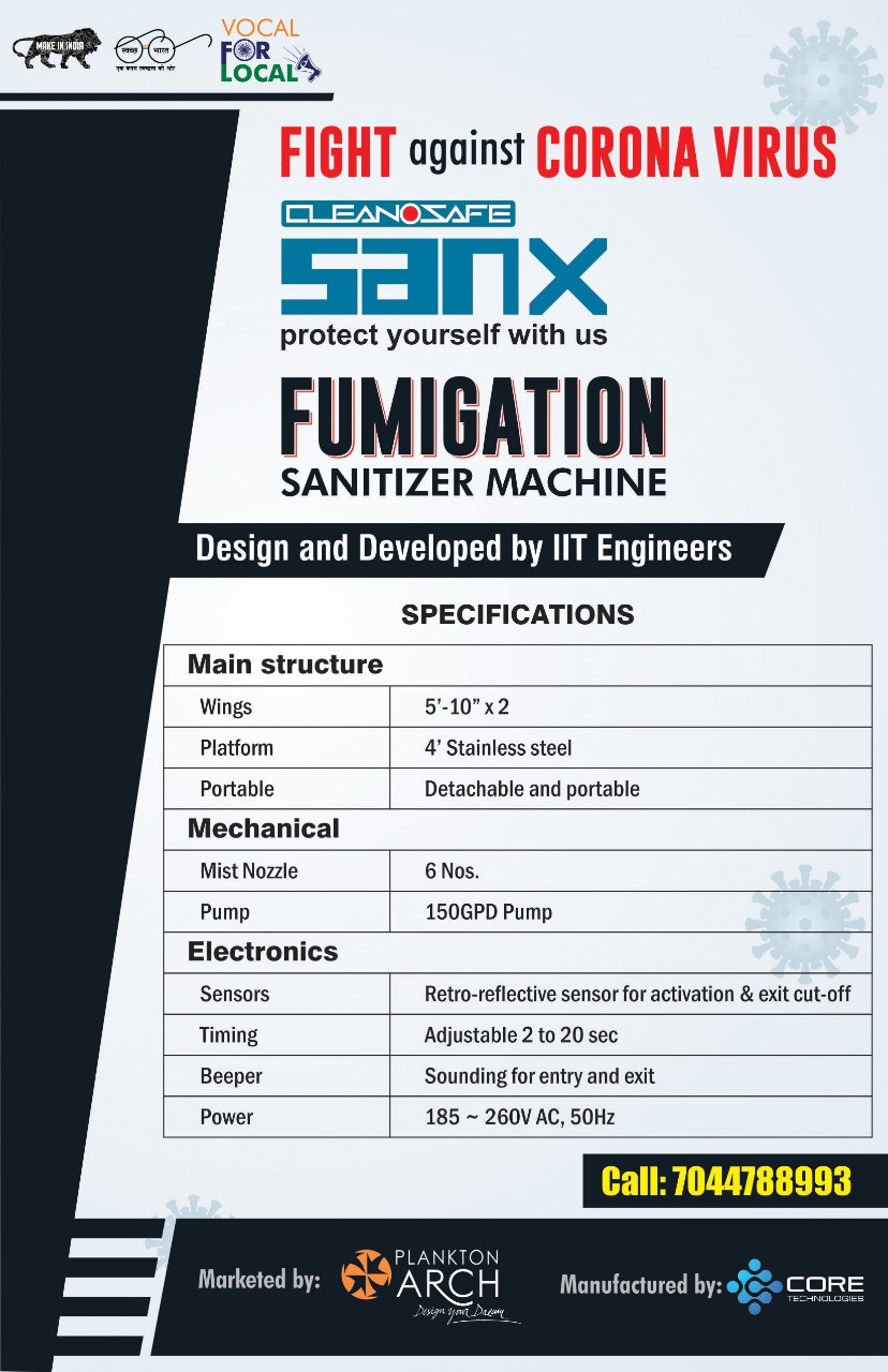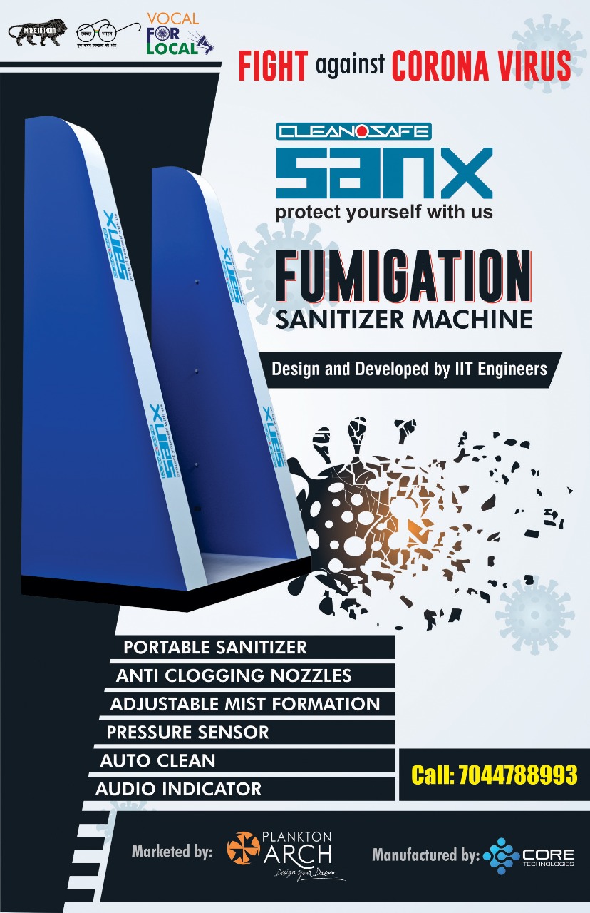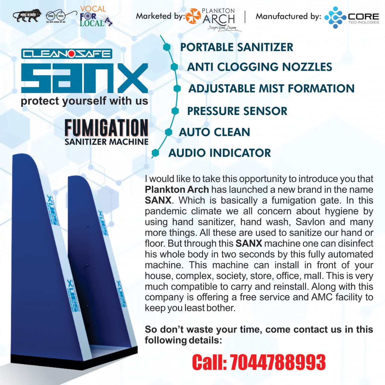 Plankton Arch, one of the most prominent company has launched a new brand named SanX, Fumigation Sanitizer Machine which is manufactured by Core Technologies and specially designed and developed by best IIT Engineers of India. SanX sanitizer machine is basically a fumigation gate. Especially designed and built with high quality Standards equipments by using advanced technology with the reasonable price.